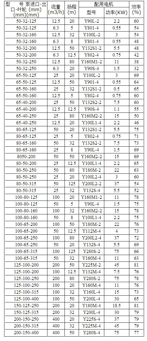 IHZ化工離心泵性能參數表
