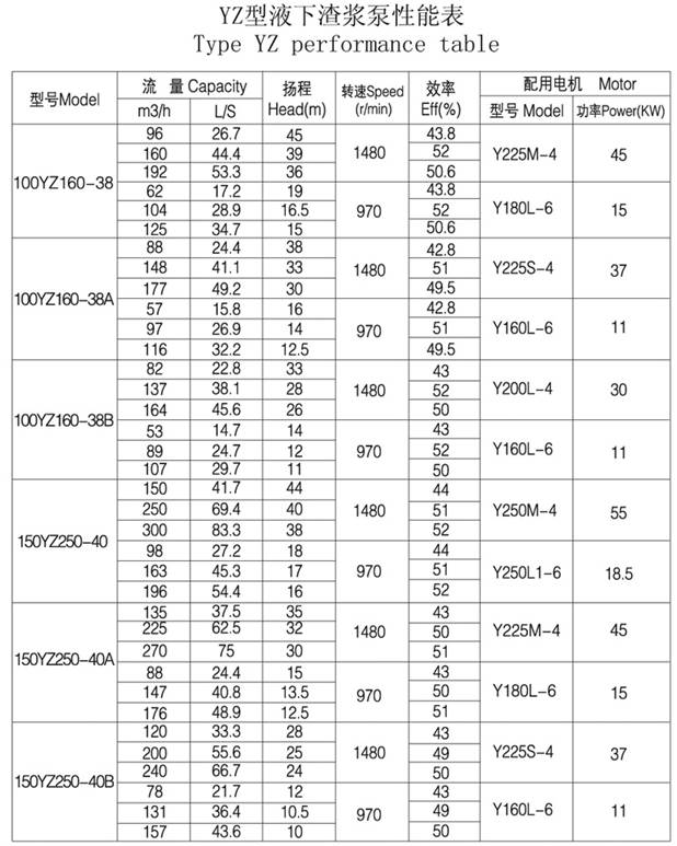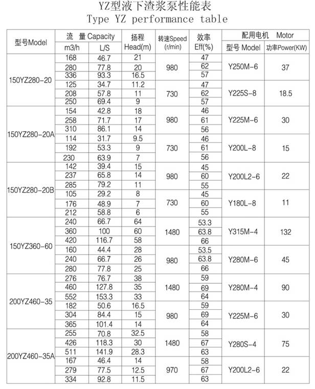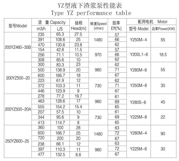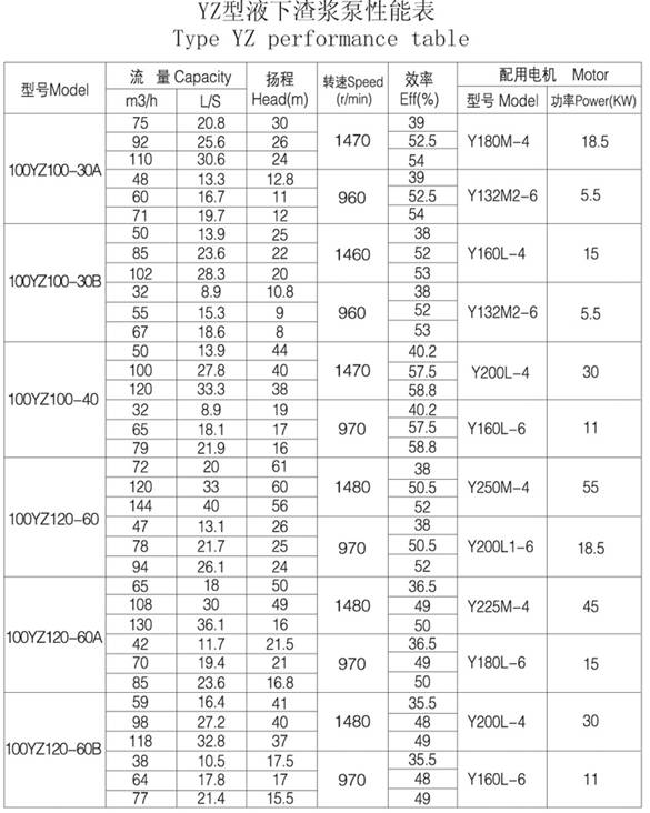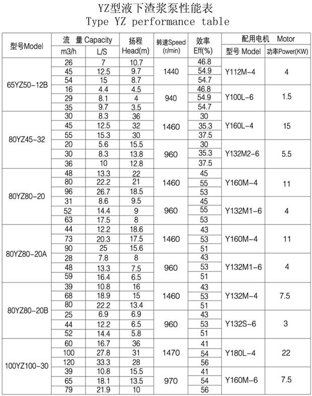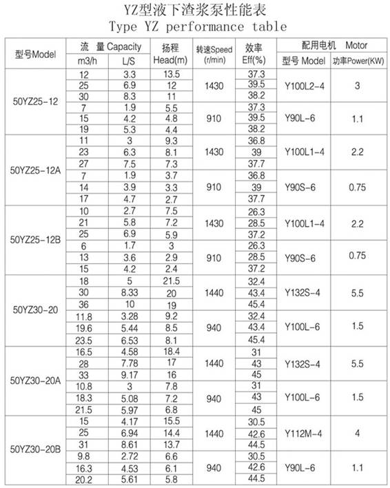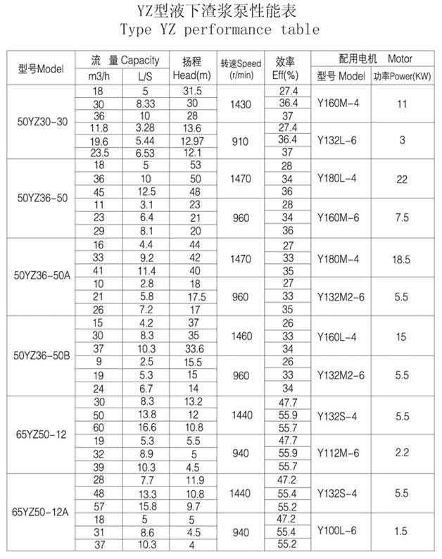 YZ型泵為單級,單吸懸臂式結構,用軸承座,支承座,聯接管連接泵的水力部件,液體由出液管部件排出,泵的葉輪為半開式葉輪,在葉輪葉片進口延伸處設有攪拌葉片,該泵主要特點是在液下部位的泵軸,有足夠的剛度,葉輪,泵殼之間不設軸承,不采用軸封,可以輸送含有較大濃度固定顆粒的介質。泵插入液下的長度在800-2000之間,如果需要可以配帶吸入管。軸封采用較大泵插入液體中運行,不設軸封,傳動由立式電動機安裝在電機支承和支承座上,用聯軸器與泵相連。